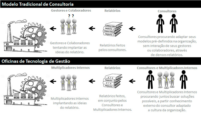 Com as OTG's, a organização, através de seus Multiplicadores Internos, com a orientação dos Consultores, deve identificar e entender o problema, participar ativamente da elaboração do diagnóstico e buscar uma solução inovadora, e também, de sua efetiva implantação. Ou seja, nesta metodologia a ação de formação não é fundamentada em um modelo passivo de treinamento ou Consultoria, mas sim, emprega uma metodologia de educação participativa, “aprendendo fazendo”, com grande troca de experiências, na qual os conceitos são aplicados de forma prática pelos Multiplicadores Internos, que são motivados, preparados e assessorados para agir em questões da própria organização.